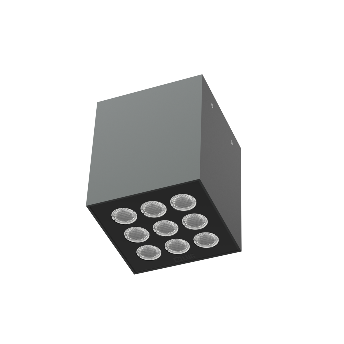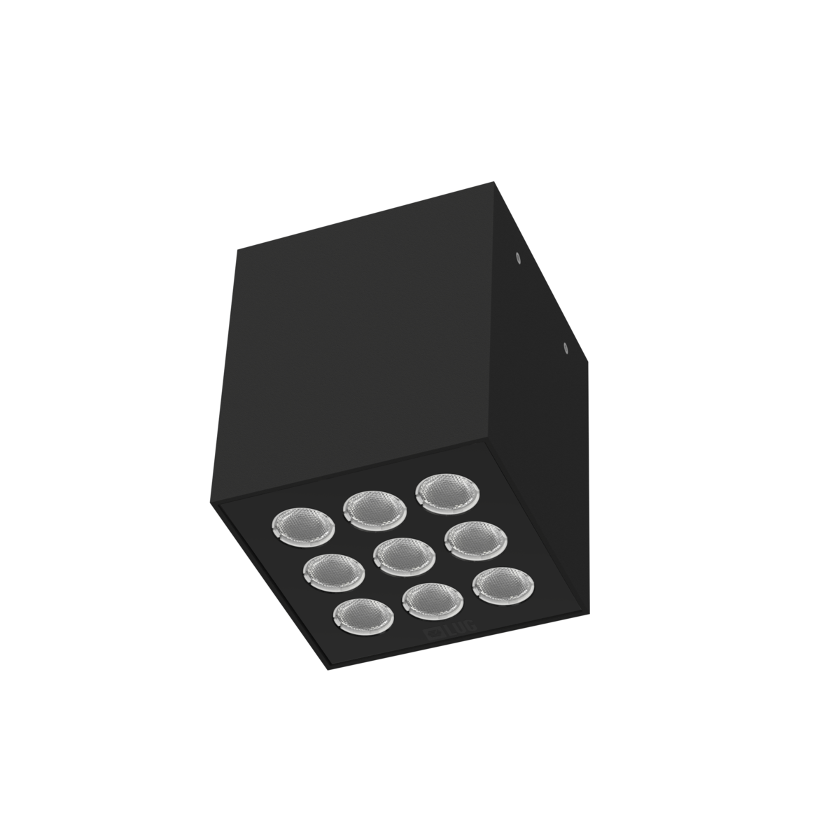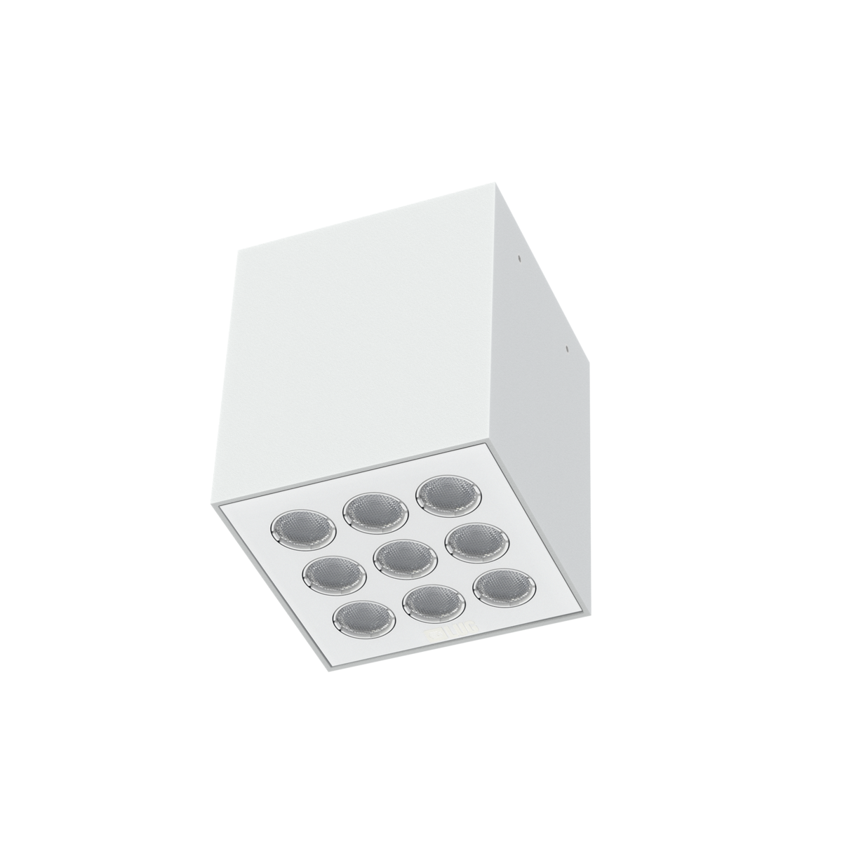An outdoor architectural luminaire for surface mounting in the form of a decorative downlight. The luminaire is available with a 9-lens optic with three monochromatic lighting angles.